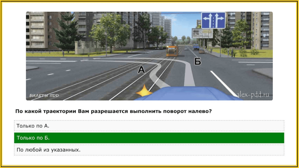 На этом перекрестке направление движения по каждой полосе определено знаком особых предписаний 5.15.1 «Направления движения по полосам», который запрещает разворот и поворот налево по траектории А с трамвайных путей попутного направления. Поворот налево должен выполняться только по траектории Б. Когда знак 5.15.1 «Направления движения по полосам» установлен, можно поворачивать налево только с полосы, указанной стрелкой на знаке. Если же знак или дорожная разметка, указывающие разрешенные на перекрестке направления движения по полосам отсутствуют, то только тогда нужно поворачивать налево или выполнять разворот с трамвайных путей попутного направления.