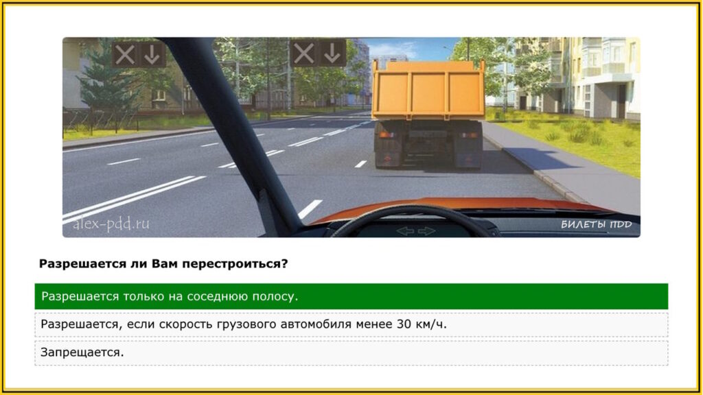 Разрешается перестроиться только на соседнюю полосу попутного направления движения. В показанной ситуации над реверсивными полосами установлены реверсивные светофоры, и эти полосы с обеих сторон не обозначены реверсивной линией разметки, которую запрещалось бы пересекать при выключенных реверсивных светофорах. Слева от нас прерывистая линия разметки, через которую можно перестроиться на соседнюю полосу попутного направления движения, а реверсивная линия в этом случае разделяет транспортные потоки противоположных направлений, когда реверсивные светофоры выключены.