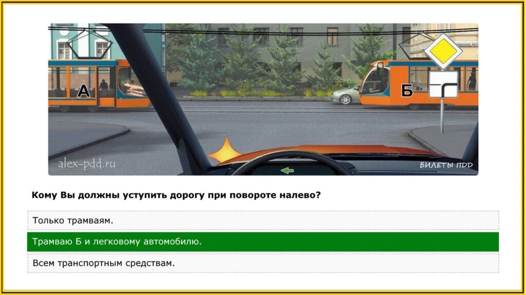 На этом перекрестке неравнозначных дорог мы должны уступить дорогу трамваю Б и легковому автомобилю. По знаку приоритета 2.1 «Главная дорога» и табличке 8.13 «Направление главной дороги» определяем, что мы на главной дороге, а трамвай А на второстепенной дороге и перед ним мы имеем преимущество на движение. А вот трамваю Б и легковому автомобилю которые также подъехали к перекрестку по главной дороге, необходимо уступить дорогу. Трамвай Б имеет преимущество перед безрельсовыми транспортными средствами, а легковой автомобиль является для нас помехой справа.