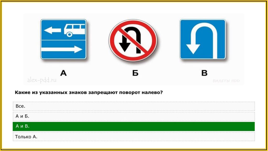 Из изображенных знаков, только знаки А и В запрещают поворот налево. Знак Б 3.19 «Разворот запрещен» запрещает только разворот, поворот налево при этом не запрещен. Знак А 5.13.1 «Выезд на дорогу с полосой для маршрутных транспортных средств» устанавливают перед выездом на дорогу, на которой общий поток транспортных средств движется слева направо, а маршрутные транспортные средства по своей полосе – справа налево. По полосе для маршруток движение других транспортных средств запрещено. Таким образом, повернуть налево на перекрестке, перед которым установлен знак А, нельзя. Знак В 6.3.1 «Место для разворота» указывает место для разворота на участке многополосной дороги между перекрестками. При этом поворот налево в этом месте, например на прилегающую территорию, запрещен. Таким образом, поворот налево запрещают знаки А и В.