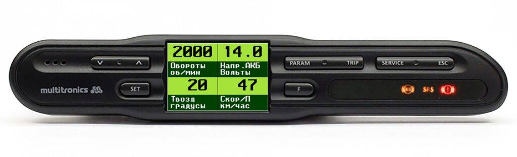 - сообщает мгновенную скорость, пробег, время до ТО, температуру, число оборотов силового агрегата;