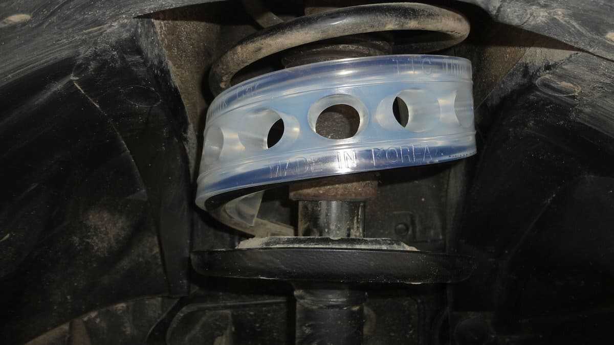 По форме автобафер это толстое, достаточно эластичное кольцо с прорезью с одной стороны. В верхней и нижней частях изделия сделаны канавки, ширина которых соответствует толщине витков пружин. Проставка монтируется в межвитковое пространство, как показано на фотографии ниже.