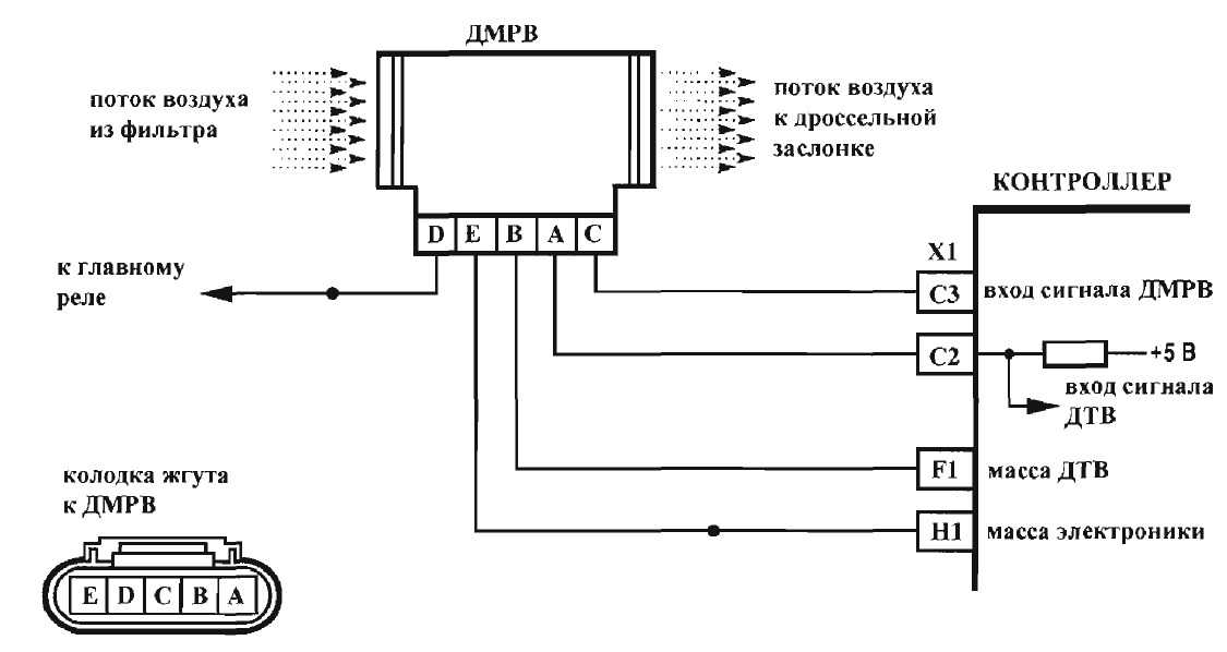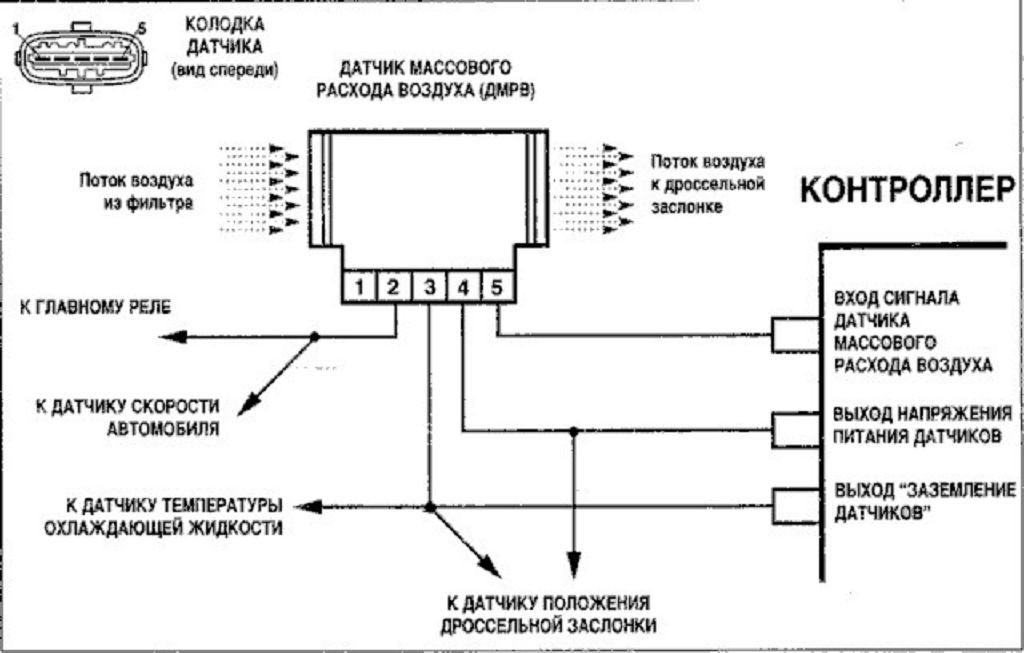 Автомобили с инжекторными двигателями имеют в своем оснащении датчик массового расхода воздуха (ДМРВ). В задачу датчика входит контроль количества забортного воздуха для создания топливовоздушной смеси поступающей в двигатель.
