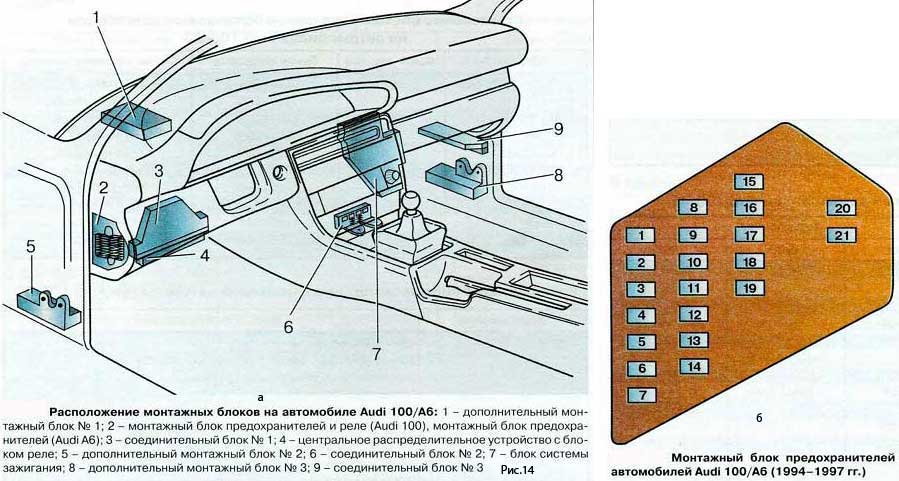 - Расположение монтажных блоков на автомобиле Ауди 100/А6