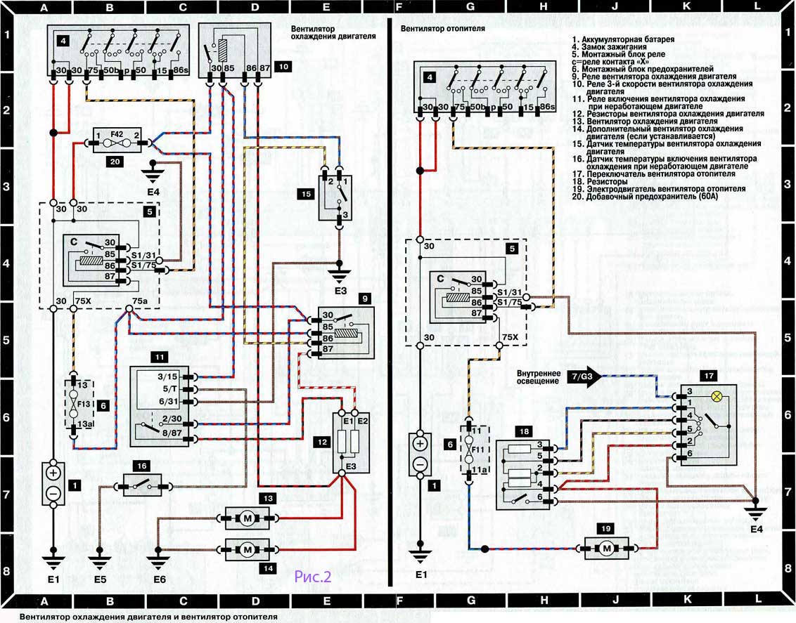 - Вентиляторы крутятся постоянно, при включенном зажигании. Сдернуть разъем с датчика включения вентиляторов, если вентиляторы продолжают вращаться, то проверить реле 2 и 8 по схеме на рис 2, возможно, что у них сварились контакты. Эти реле расположены в дополнительном блоке реле. Если при снятии разъема вентиляторы остановились, то датчик под замену.