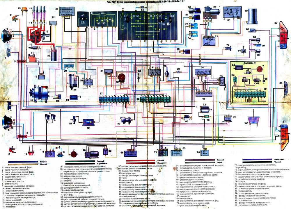 Штепсельная розетка под номером 6, стеклоомыватель и стеклоочиститель — 7 и 9 соответственно. 28 — комбинация приборов, 41 — амперметр, 43 — прикуриватель, 47 — генератор, 48- регулятор напряжения, 59,60 — стартер, 64 — аккумуляторная батарея. Здесь же представлена и вторая цветная схема газ 2410, с большим числом элементов, подписи и расшифровку которых вы найдете прямо на схеме.