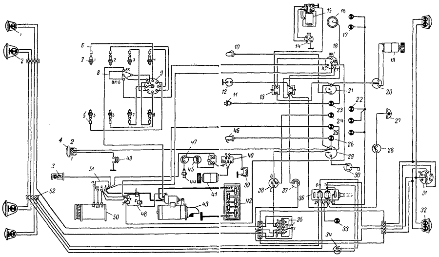 рис. 122. Схема электрооборудования автомобиля ГАЗ-53А: 1— подфарник; 2 — фара; 3 — подкапотная лампа; 4 — сигнал; 5 — гасящее сопротивление; 6 — провод высокого напряжения; 7 — свеча зажигания; 8 — катушка зажигания; 9 — распределитель; 10 — датчик температуры охлаждающей жидкости; 11 — датчик давления масла; 12 — штепсельная розетка переносной лампы; 13 — биметаллический предохранитель; 14 — переключатель стеклоочистителя; 15 — стеклоочиститель; 16 — часы; 17 — лампа освещения часов; 18 — включатель зажигания и стартера; 19 — электродвигатель отопителя; 20 — переключатель электродвигателя; 21 — указатель температуры охлаждающей жидкости; 22 — лампа освещения приборов; 23 — контрольная лампа давления масла; 24 — контрольная лампа указателя поворотов; 25 — контрольная лампа зарядки; 26 — контрольная лампа температуры охлаждающей жидкости в радиаторе; 27 — плафон; 28 — включатель плафона; 29 — указатель уровня топлива; 30 — датчик указателя уровня топлива ; 31 — штепсельная розетка прицепа; 32 — задний фонарь; 33 — контрольная лампа дальнего света; 34 — ножной переключатель света; 35 — переключатель указателей поворотов; 36 — центральный переключатель света; 37 — включатель света «Стоп»; 38 — прерыватель указателей поворота; 39 — электромагнитный клапан предпуского подогревателя; 40 — переключатель режимов работы предпускового подогревателя; 41 — электродвигатель вентилятора предпускового подогревателя; 42 — аккумуляторная батарея; 43 — стартер; 44 — запальная свеча предпускового подогревателя; 45 — дополнительное сопротивление; 46 — датчик контрольной лампы температуры охлаждающей жидкости в радиаторе; 47 — включатель запальной свечи; 48 — дополнительное реле стартера; 49 — включатель звукового сигнала; 50 — генератор; 51 — реле-регулятор; 52 — соединительная панель.