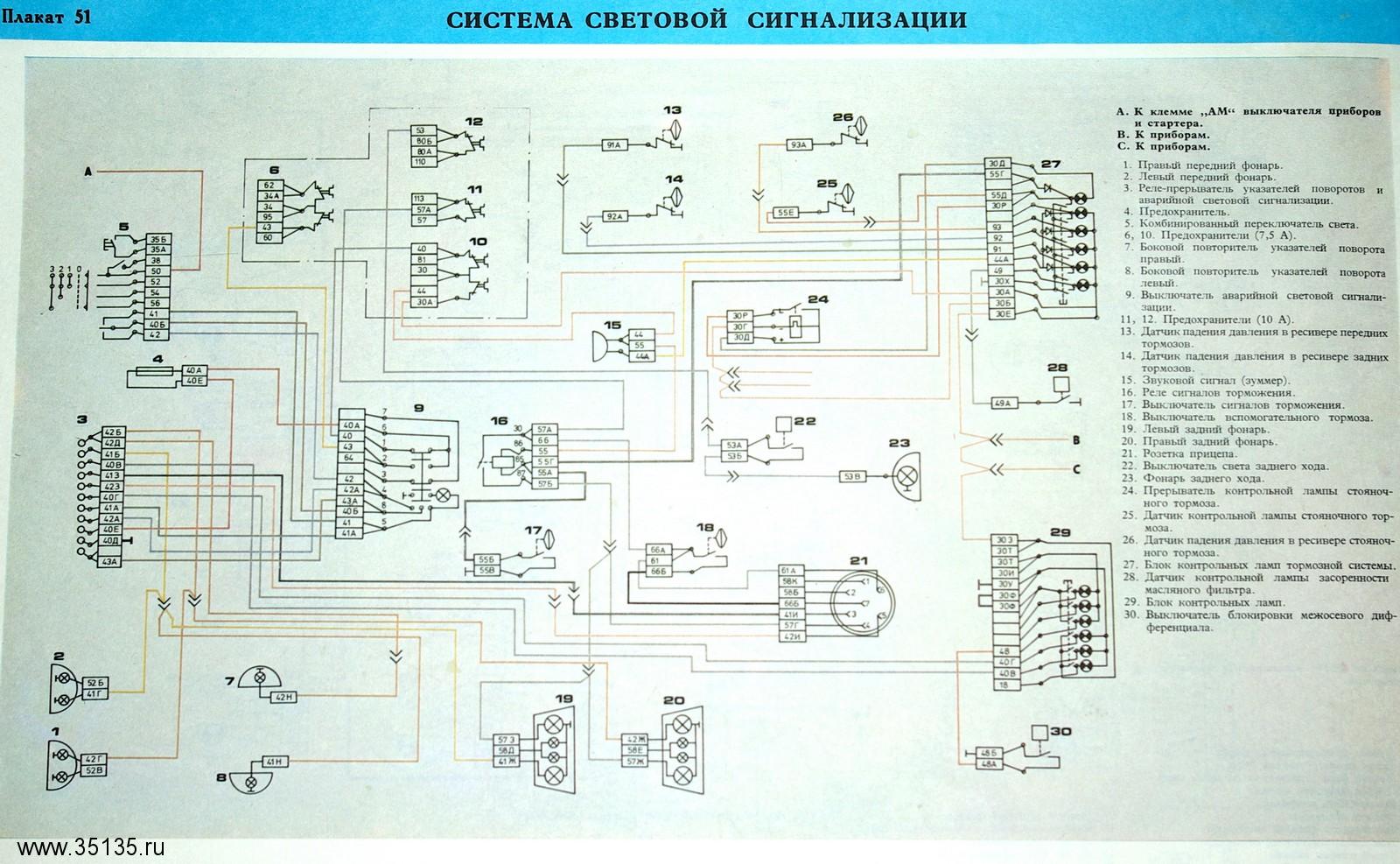 Электростартер управляется через реле, при помощи выключателя приборов. Электросхема блока освещения Внутреннее и наружное освещение предназначены для эксплуатации автомобиля в условиях плохой видимости и темное время суток. Функциональная схема световой и звуковой сигализации тормозной системы. Звуковая сигнализация предназначена для оповещения о нормальной работе агрегатов. Несмотря на прекращение производства, устройство активно применяется в строительстве, так как до сих пор актуально по своим параметрам. Электрооборудование КАМАЗ. Схемы эектрооборудования.ТОэлектрооборудования автомобиля КАМАЗ