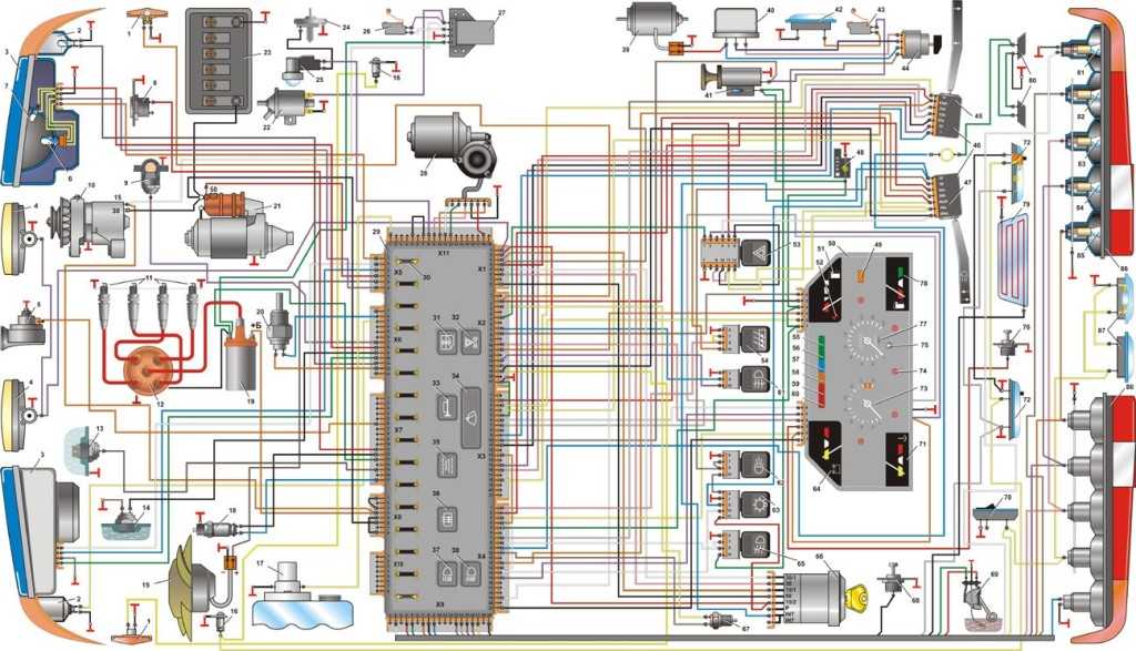 1 – боковой повторитель указателя поворота МОСКВИЧ 2141; 2 – передний указатель поворота; 3 – головная фара; 4 – противотуманная фара; 5 – звуковой сигнал; 6 – лампа ближнего и дальнего света фары; 7 – лампа габаритного света головной фары; 8 – штепсельная розетка; 9 – датчик контрольной лампы аварийного давления масла; 10 – генератор МОСКВИЧ 2141; 11 – свечи зажигания; 12 – распределитель зажигания; 13 – датчик указания температуры охлаждающей жидкости; 14 – датчик включения электровентилятора; 15 – электровентилятор; 16 – дверной выключатель плафонов; 17 – электродвигатель омывания ветрового стекла; 18 – выключатель контрольной лампы гидропривода тормозов; 19 – катушка зажигания; 20 – выключатель света заднего хода; 21 – стартер; 22 – электромагнитный клапан; 23 – аккумуляторная батарея; 24 – выключатель подкапотной лампы; 25 – подкапотная лампа МОСКВИЧ 2141; 26 – микровыключатель; 27 – блок управления ЭПХХ; 28 – стеклоочиститель; 29 – блок предохранителей и реле; 30 – предохранитель; 31 – реле включения противотуманных фар; 32 – реле-прерыватель указателей поворота и аварийной сигнализации; 33 – реле включения звукового сигнала; 34 – реле стеклоочистителя; 35 – реле включения электровентилятора; 36 – реле включения обогрева окна двери задка; 37 – реле включения ближнего света фар; 38 – реле включения дальнего света фар; 39 – электродвигатель отопителя; 40 – резистор электродвигателя отопителя; 41 – прикуриватель; 42 – плафон освещения вещевого ящика; 43 – микровыключатель; 44 – переключатель отопителя; 45 – переключатель стеклоочистителя и омывателя ветрового стекла; 46 – подрулевой переключатель; 47 – переключатель указателей лампа; 48 – лампа световода рычагов управления отопителем; 49 – замедлитель; 50 – комбинация приборов; 51 – указатель уровня топлива; 52 – контрольная лампа резерва топлива; 53 – выключатель аварийной сигнализации; 54 – выключатель обогрева окна двери задка МОСКВИЧ 2141; 55 – сигнальная лампа включения указателей поворота; 56 – сигнальная лампа включения габаритного света; 57 – сигнальная лампа включения дальнего света фар; 58 – сигнальная лампа закрытия воздушной заслонки карбюратора;