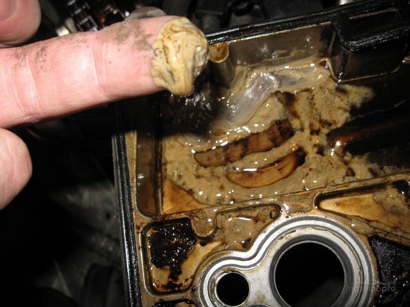 Когда капли упали в масляную жидкость, они не растворяются, а смешиваются с ней. В состоянии покоя вода оседает на дне картера, но как только «движок» включается, масло начинает циркулировать. Работая, мотор позволяет воде «дробиться» на много мелких пузырьков. Они взбиваются вместе с маслом, превращаясь в пенистую эмульсию. Вещество прилипает к пробке, крышке, а иногда к масляному щупу.