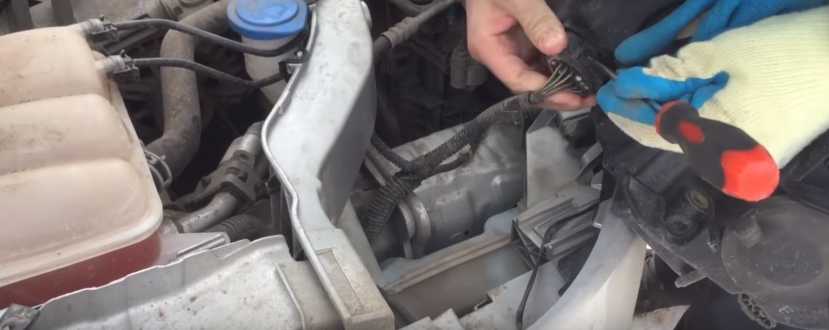 - Снимаем клемму с проводами от лампы Форд Фокус 3 (черный штекер).