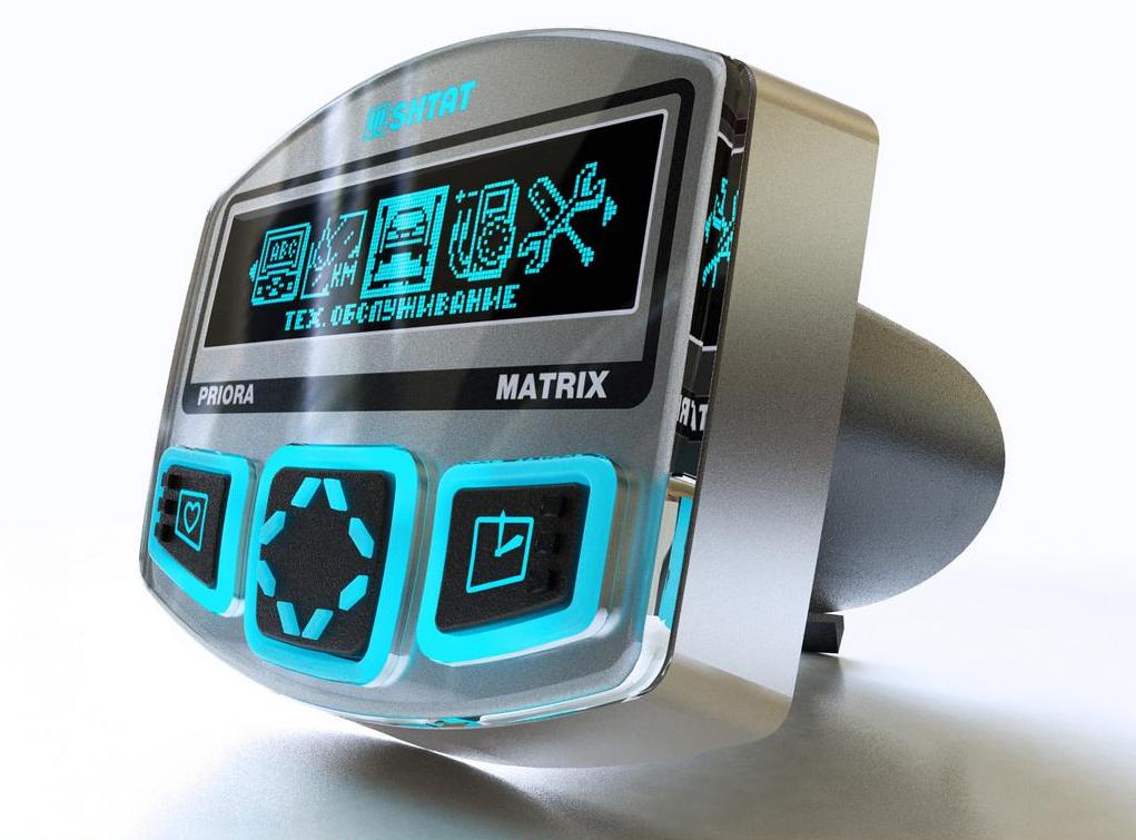 - Приора Штат Matrix. Более серьезный бортовой компьютер. Ставится на место штатных часов и имеет графический дисплей 128 х 32 пикселя.