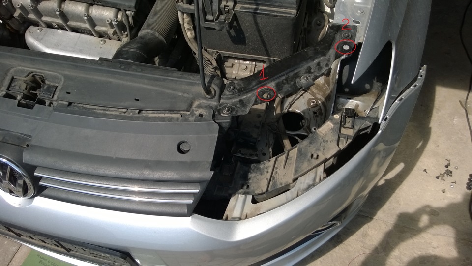 - Для начала откройте верхнюю часть передней монтажной панели («ТВ»). Здесь нужно открутить по два болта с каждой стороны, чтобы достать и правую, и левую фару. Болты снимаются.