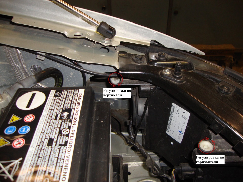 Затем нужно открыть капот. На нем имеются все элементы, с помощью которых осуществляется регулировка фар. У каждой блок-фары есть по два зеркально расположенных рычага регулировки. На стену, к которой будет направляться свет фар, нужно нанести ориентиры для корректировки света.