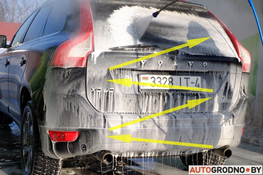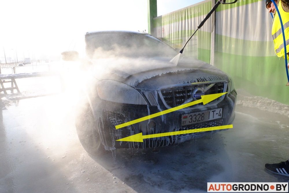 На каждый участок кузова будет наноситься свежий раствор. Если двигаться наоборот, то свежий раствор будет постоянно наноситься на стекающий сверху и концентрация активного вещества снизится. 2. Лучше видны обработанные участки кузова.