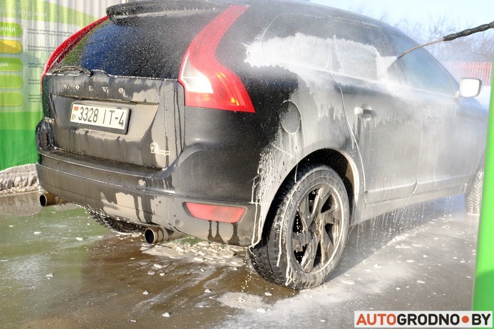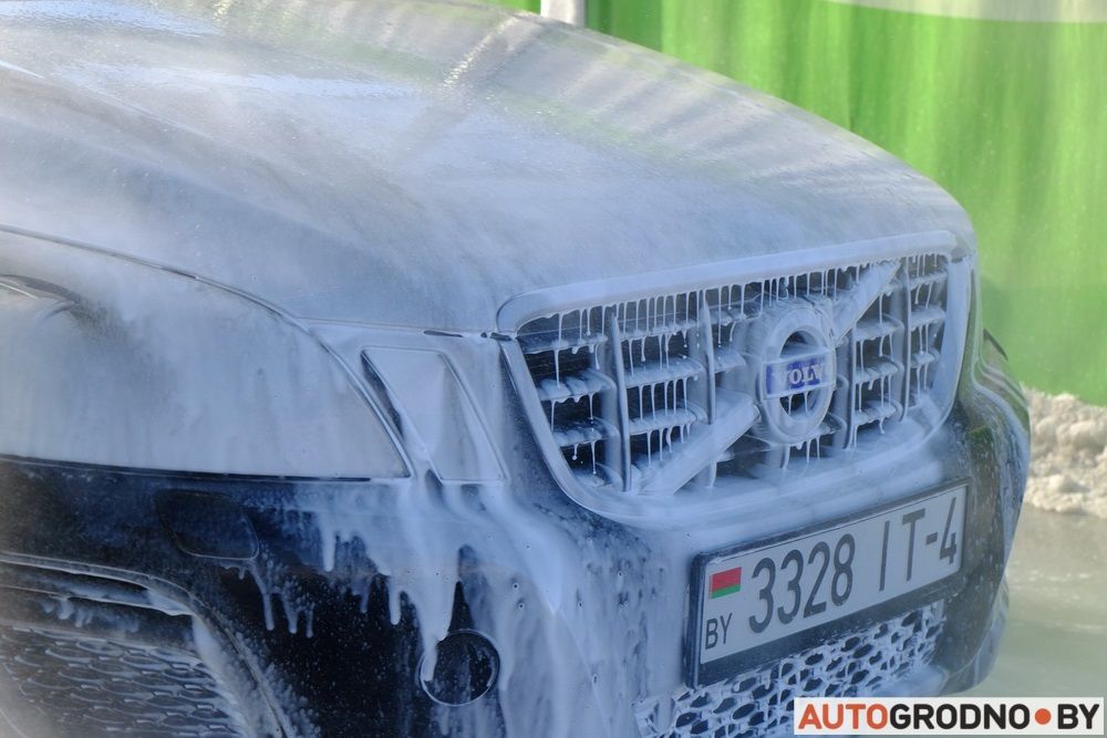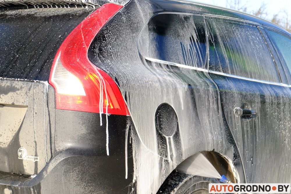 Наносить моющее вещество достаточно за один проход вокруг автомобиля.