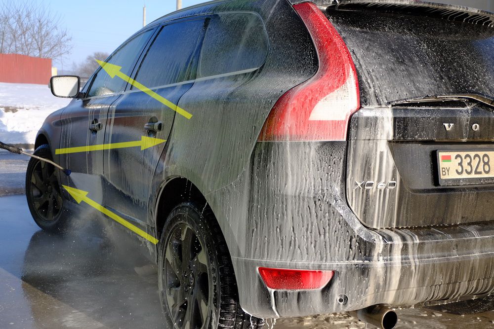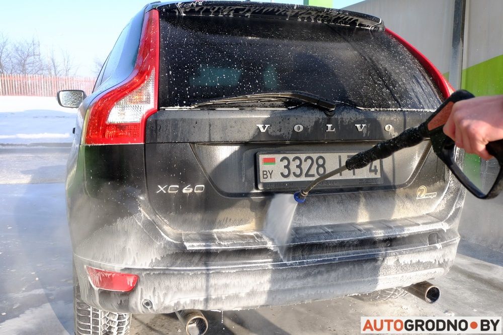 Начинать мойку автомобиля нужно с нанесения на кузов активной пены. Пистолет нужно держать на расстоянии 20-30 сантиметров от поверхности автомобиля, это касается работы во всех режимах. Давление воды из форсунки пистолета на мойках самообслуживания порядка 110 бар (на ручных около 180 бар). Если подносить пистолет ближе, лак после некачественного ремонта может слазить. Автомобили, окрашенные на производстве и/или по технологии выдерживают и более мощный напор струи.