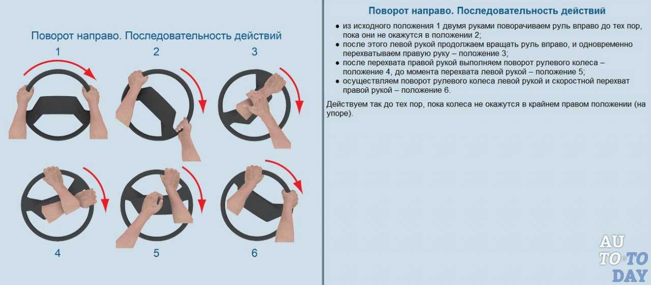 - Затем следует действовать по следующей схеме: продолжать выворачивать рулевой обод, перехватывая его.