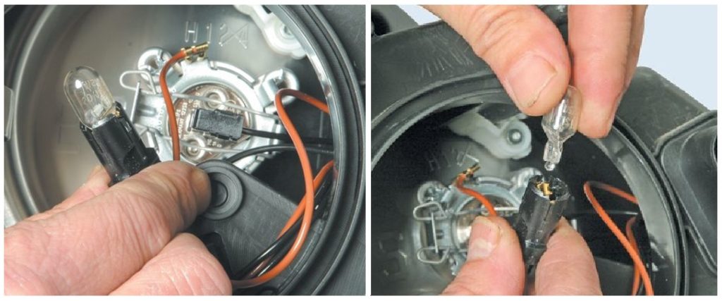 Для замены лампы габаритов необходимо вынуть патрон с лампой из отражателя фары. Для этого тянем его на себя и извлекаем лампы W5W из патрона.