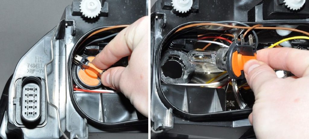 - Теперь можно вынимать галогенку и аккуратно вставлять новую лампу Н7 в корпус блок-фары.