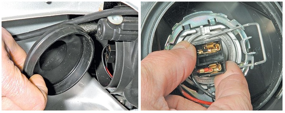Снимаем резиновую крышку, которая расположена у крыла авто. Затем снимаем разъем с лампы.