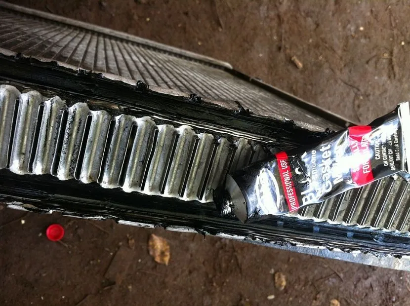 Полимерный герметик используют для временного устранения проблемы, чтобы появилась возможность добраться своим ходом до сервисного центра. Такой способ позволяет заделать патрубки с пробоинами или трещинами размерами до 2 мм при отвердении до рабочего состояния за 10 минут. Если полимерное средство не закрыло отверстие, то придется удалять материал и выбирать другой способ восстановления герметичности.