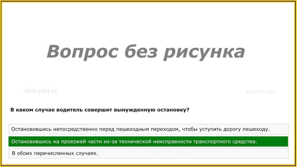 По разным причинам во время движения водитель выполняет остановку транспортного средства. В основном производит преднамеренную остановку, по желанию самого водителя или пассажира или же останавливает транспортное средство для выполнения требований правил дорожного движения (остановка по требованию сотрудника полиции, запрещающий сигнал светофора, либо остановка перед пешеходным переходом, чтобы уступить дорогу пешеходу). Но иногда водитель должен совершить вынужденную остановку, указанную во втором ответе. Остановка на проезжей части из-за технической неисправности – одна из четырех причин вынужденной остановки, другие причины, такие как опасность, создаваемая перевозимым грузом, либо внезапное ухудшение состояния водителя (или пассажира), а также появление препятствия на дороге (например, упавший груз или завал на дороге) в ответах не указаны. Из предложенных ответов вынужденной остановкой следует считать только остановку на проезжей части из-за технической неисправности транспортного средства.