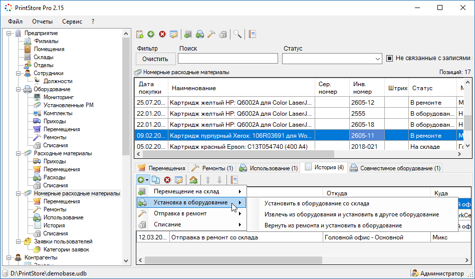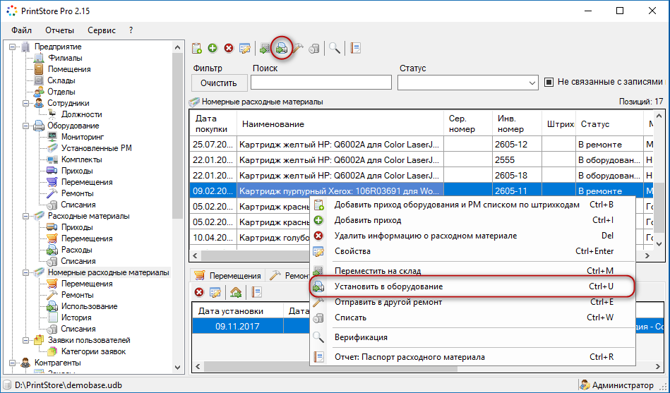 Рассмотренный выше способ установки материалов в оборудование применим как к обычным, так и к номерным расходникам (они представлены в одном диалоге). Однако НРМ может быть установлен в печатное устройство не только со склада, но и после извлечения из другого оборудования или возврата из сервиса. Оформить запись о расходе НРМ можно в разделе «Номерные расходные материалы» с помощью кнопки / команды «Установить в оборудование» (Ctrl+U).