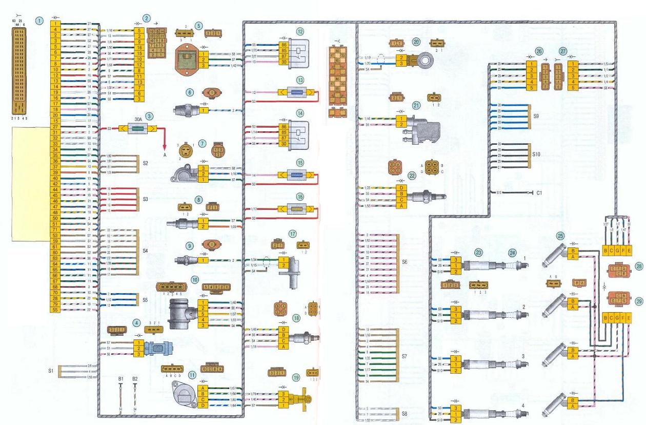 Блок с предохранительными устройствами, позволяющими защитить оборудование в электроцепи авто при возможных скачках напряжения. Соединительные разъёмы переднего, заднего жгута и жгута панели приборов находятся под торпедой с левой стороны. В частности, автомобиль получил: Три силовых агрегата разной мощности от 87 л. Электросхема соединения жгута панели приборов Ваз , Ваз , Ваз 1.