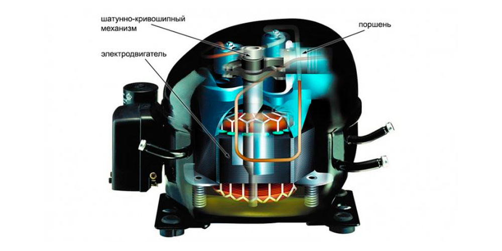 В задней части холодильника, снизу, мы обычно видим корпус компрессора, окрашен он обычно в чёрный цвет, внутри которого он герметично закрыт. Он находится в состоянии невесомости, в масляной ванне. Компрессоры у большинства моделей бытовых холодильников по конструкции не отличаются. Обычно их конструкция представлена в виде поршневого электродвигателя с пусковой обмоткой, работающей от переменного электрического тока. Принцип работы: компрессор постоянно создаёт давление, под действием которого пары хладагента (фреона) попадают в конденсатор, где они охлаждаются и в виде жидкости по медным трубкам идут далее, охлаждая внутренность холодильника и забирая тепло, после чего попадает в испаритель, а из него обратно в компрессор. Процесс цикличен. Естественно, если двигатель не включается, то система функционировать не будет.