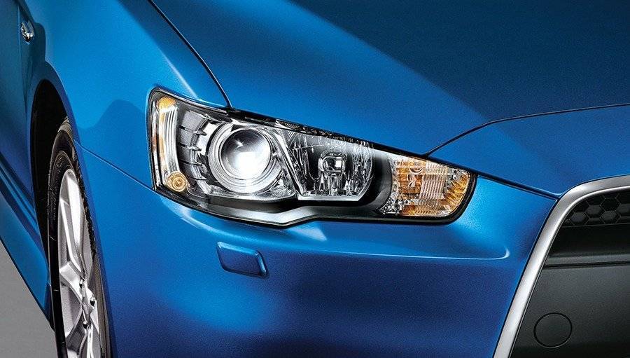 - Автомобили Митсубиси Лансер оборудованы блок-фарами головного света, в которых объединены ближний и дальний, лампы поворота и габариты.