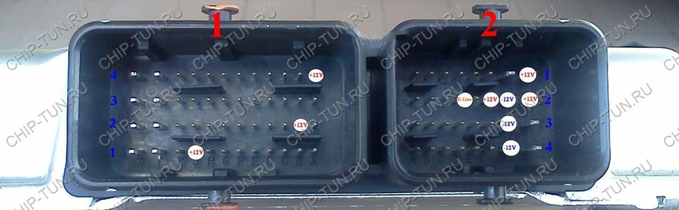 Потребуется 6 проводов «+», 1 провод «–», 1 провод «К-лайн», 2 переключателя (кнопки) Разъем 1 (Большой) J1 — отключаемое напряжение (К15) 12В — второй выключатель B2 — разрешение программирования (12В) — первый выключатель A4 -разрешение программирования (12В) — первый выключатель Разъем 2 (Маленький) G2;G3;G4 — Масса (достаточно подключить любой из этих контактов) H1;H2 — неотключаемое напряжение (К30) F2 — отключаемое напряжение (К15) 12В — второй выключатель D2 — K-Line