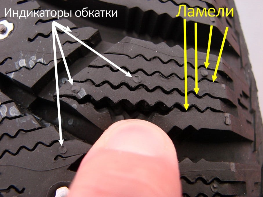 Например, на летних могут быть цветные полосы на рабочей поверхности покрышки. На зимних — наличие зазубрин либо других индикаторов вокруг шипа.