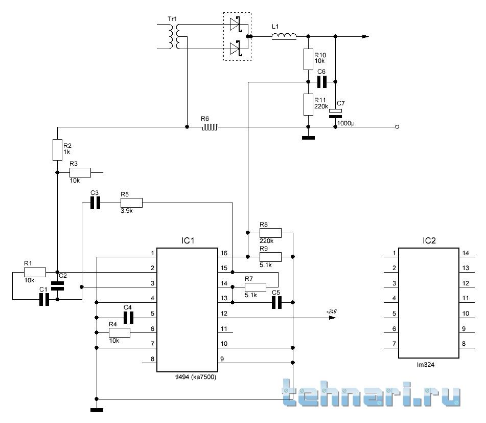 - Необходимо найти микросхему TL 494 или её аналог. Список аналогов легко найти в интернете, один из них обязательно будет найден в схеме. При всём многообразии блоков без этих микросхем их не производят.