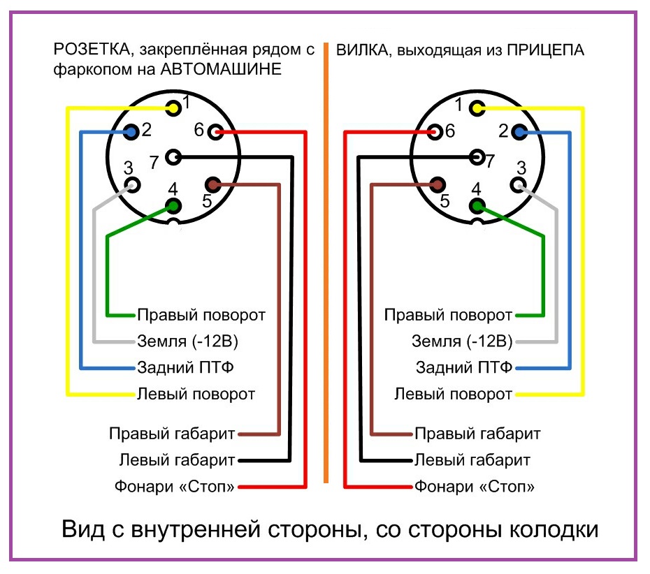 Посмотрите на картинке разъем фаркопа. Выключение не составит особой сложности, особенно если имеется универсальный составляющий элемент, представляющий собой разъем фаркопа. Очень удобно производить соединение в том случае, если вилка и розетка совпадают по разъемам. Соответственно, розетка, состоящая из семи контактов, должна подключаться к семиконтактной вилке . В таком варианте можно будет производить обычное подключение, не забывай совмещать нужные гнезда с соответствующими розетками.