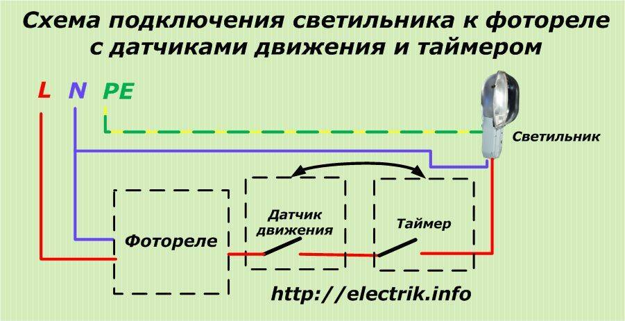 При условии, что, помимо датчика, необходимо подключение дополнительных приборов, типа таймера или датчика движения, они находятся в сети подключения после фотореле. В данном случае, порядок инсталляции таймера или датчик движения не имеет значения.