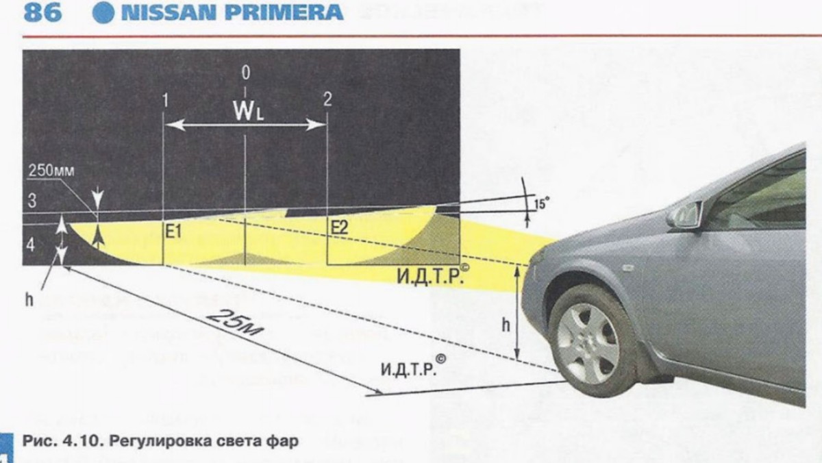 Самый простой, но не очень точный способ — подъехать к стене и «на глаз» настроить пучки света. Еще один простой, но чуть более точный способ — найти на стене трафарет для регулировки фар. Такие часто висят на стенах СТО. Вместо коленей помощника и воображаемого уровня регулировки на трафарете будут отмечены места, куда должен попадать свет фар.