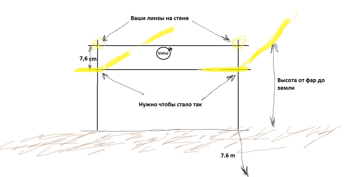 Включите фары ближнего света и сделайте отметку на стене с центром двух лучей.