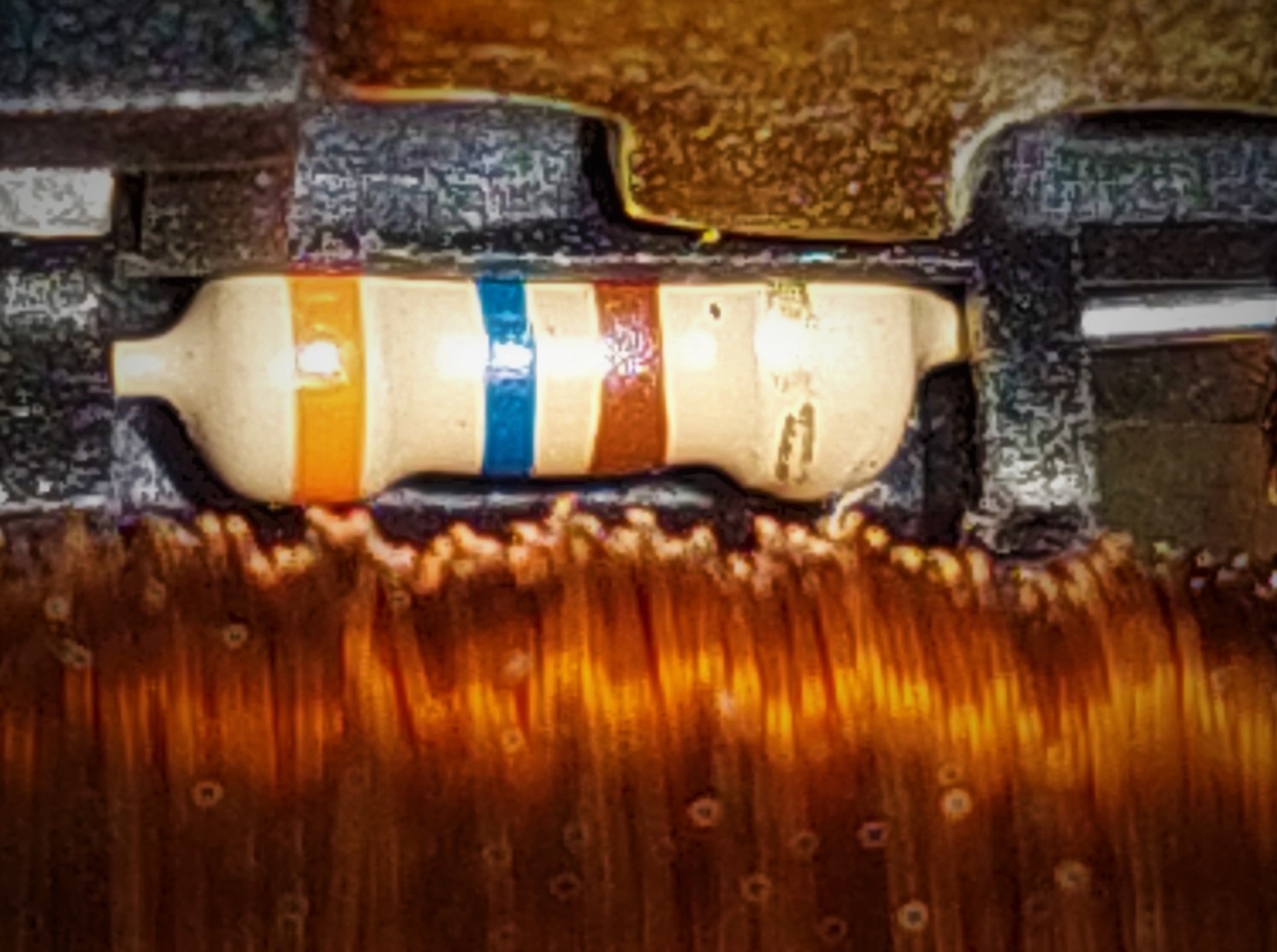 Осциллограмма реле с резистором уже имеет бросок обратного напряжения 35 вольт, что уже не так много и скорее всего характеристики транзисторов и микросхем рассчитаны на такое обратное напряжение. Если кому интересен номинал такого сопротивления, то я измерил его мультиметром, оно составило 357 Ом (по цветовой маркировке 360 Ом), а обмотка реле имеет сопротивление 84 Ом. Посмотрел сопротивление на более крупном силовом реле (артикул 71.3747-21) по цветовой маркировке тоже получается 360 Ом, сопротивление обмотки по расчётам около 80 Ом.