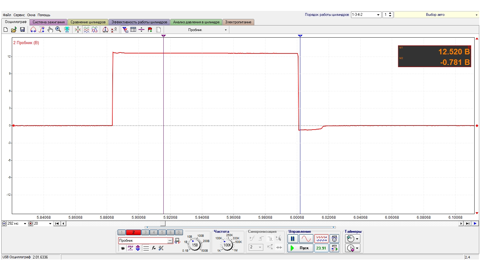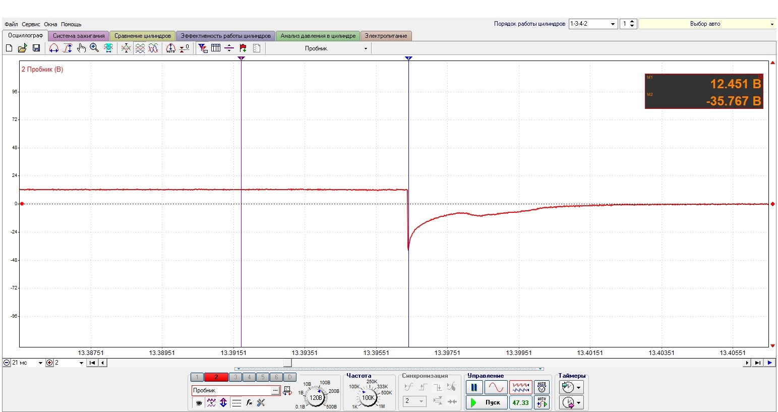На осциллограмме у силового реле обратное напряжение получилось 46 вольт: