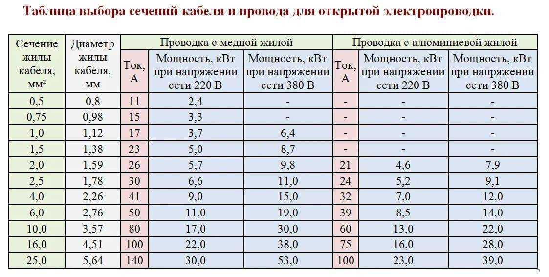 Сечение медного провода по мощности можно установить по таблицам ПУЭ. Для кабеля с медным сердечником.