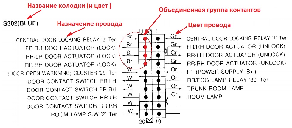 В некоторых электросхемах есть отдельное описание каждой колодки и расписано назначение проводов, подводимых к ней. Главная отличительная особенность колодки (Splice) от разъема (Connector) в том, что соединяется группа проводов: есть один входящий провод и группа исходящих потребителей, как правило, это шины питания.