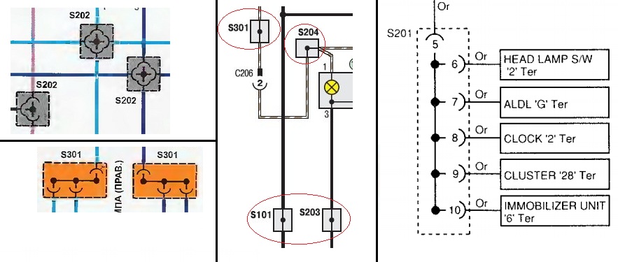 Помимо разъемов (Connectors) провода в автомобиле соединяются при помощи пакета перемычек или соединительных колодок ( в электросхемах на английском – Splice). Обозначаются соединительные колодки, как вы видите на рисунке, буквой “S” и порядковым номером, например: S202, S301.