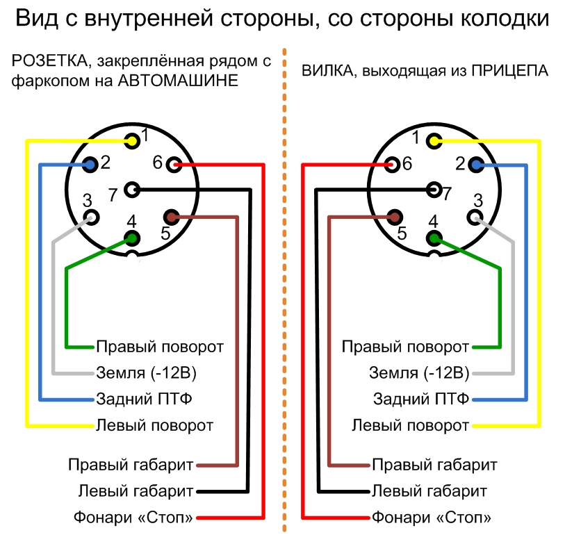 Контакт №2 во многих прицепах может быть не задействован. Он используется для обеспечения постоянного электропитания + 12 на легковых прицепах. Некоторые автолюбители игнорируют разделение по правому и левому габаритному огню, объединяя их схемотехнически в единый провод.