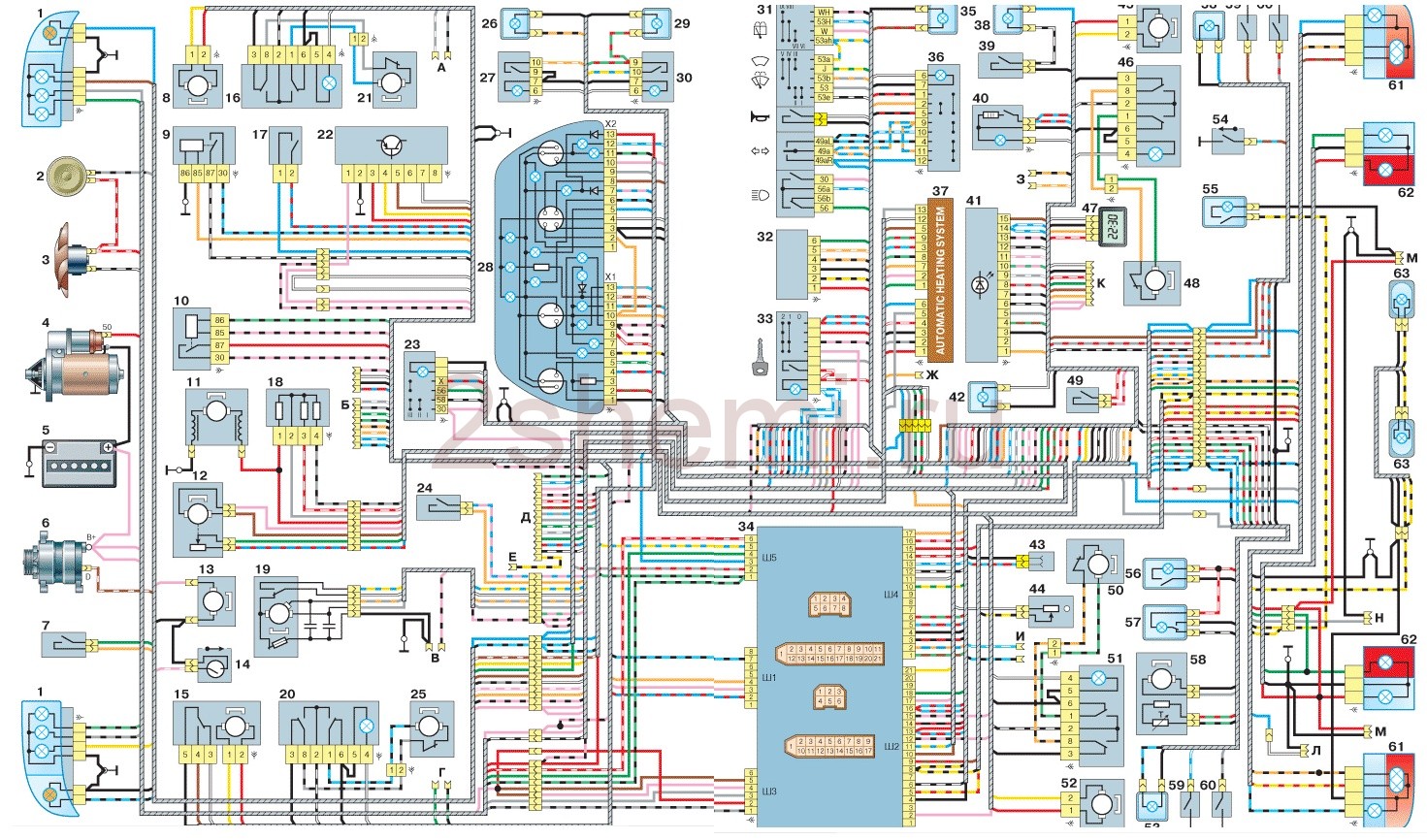 Общая схема проводки для 2111 Сначала предлагаем разобраться в том, какие в схеме электропроводки используются системы и узлы.