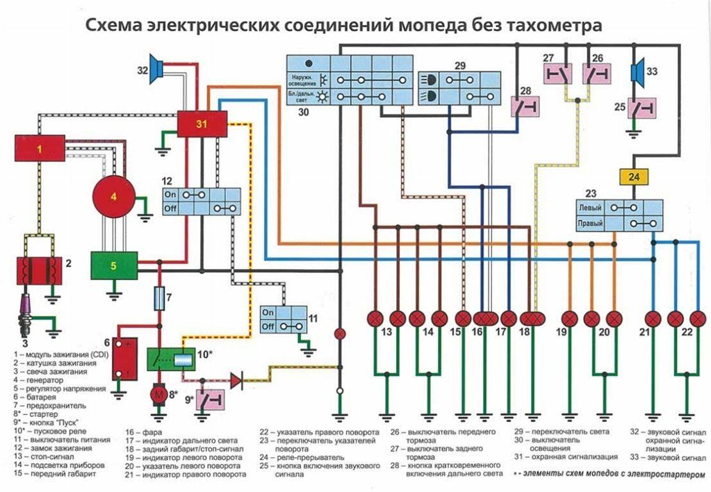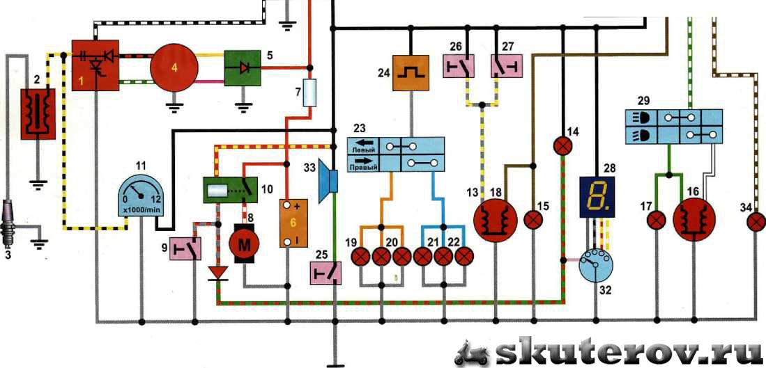 Добраться до него нелегко. Красный уходит в замок зажигания, от которого поворотом ключа можно замкнуть систему и заставить работать. Да, та самая, что освещает нам дорогу в тёмное время суток. Одной из самых важных электрических цепей скутера является схема зажигания. В некоторых моделях скутеров для блокировки двигателя предусмотрена кнопка стоп-двигатель 27 , которая также, как и замок зажигания соединяет бело-чёрный и зелёный общий, корпусной провод.