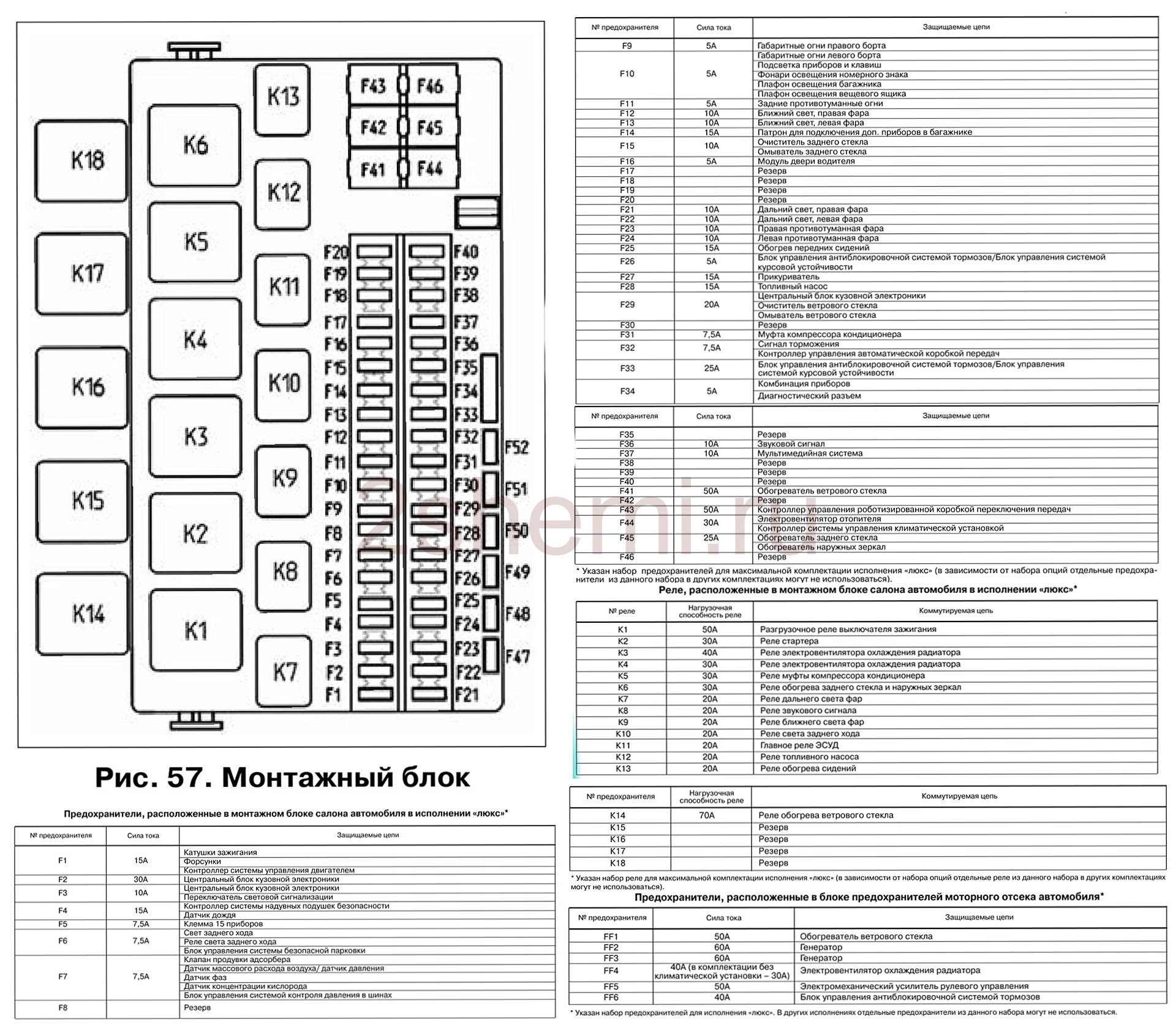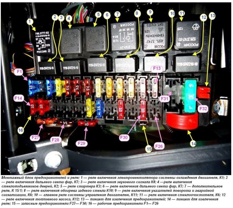Как показывает схема электрооборудования, наибольшее число приборов расположилось в подкапотном пространстве. Здесь также присутствует монтажная плата с силовыми предохранительными элементами, количество которых приравнивается к пяти.