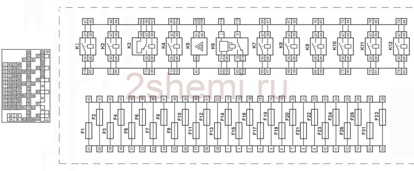 Блок снабжен 32-мя предохранителями и 12-ю реле.