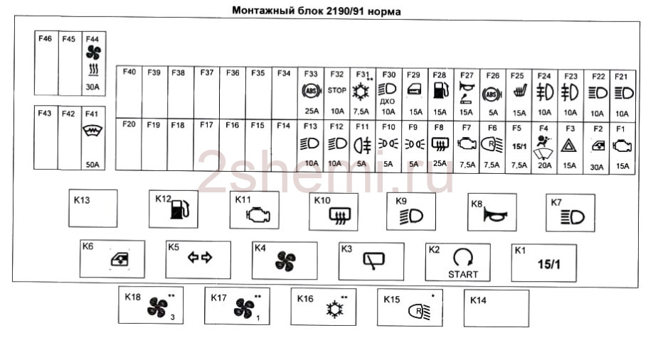 | F6 | 7.5 | Свет заднего хода ВАЗ-2190 Указатели поворота (Стандарт) Контроллер управления автоматической коробкой переключения передач (Норма, Люкс) Блок управления системой безопасной парковки (Норма, Люкс) |