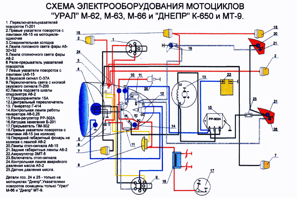 1 — переключатель света и аварийный выключатель зажигания; 2 — включатель стоп-сигнала ручного тормоза; 3 — правые указатели поворотов с лампами А1 2-10; 4 — лампа подсветки шкалы спидометра А12-1; 5 — лампа головного света фары А12-45+40; 6 — контрольная лампа дальнего света А12-1; 7 — контрольная лампа указателей поворотов А12-1; 8 — контрольная лампа нейтрали в коробке передач; 9 — лампа переднего габаритного/стояночного огня А12-4; 10 — левые указатели поворотов с лампами А12-10. 11 — переключатель света, указателей поворотов и кнопка звукового сигнала; 12-замок зажигания 058; 13 — свеча А23В; 14 — включатель контрольной лампы нейтрали; 15 — звуковой сигнал; 16 — аккумуляторная батарея 6МТ-5; 17 — предохранитель 8А; 18 — зарядное устройство; 19 — катушка зажигания 2102.3705; 20 — реле-прерыватель указателей поворотов 25.3747; 21 — блок БКС 262.3734; 22 — включатель стоп-сигнала ножного тормоза; 23 — лампа стоп-сигнала А12-10; 24 — лампа заднего габаритного/стояночного огня А12-5; 25 — генератор 43.3701